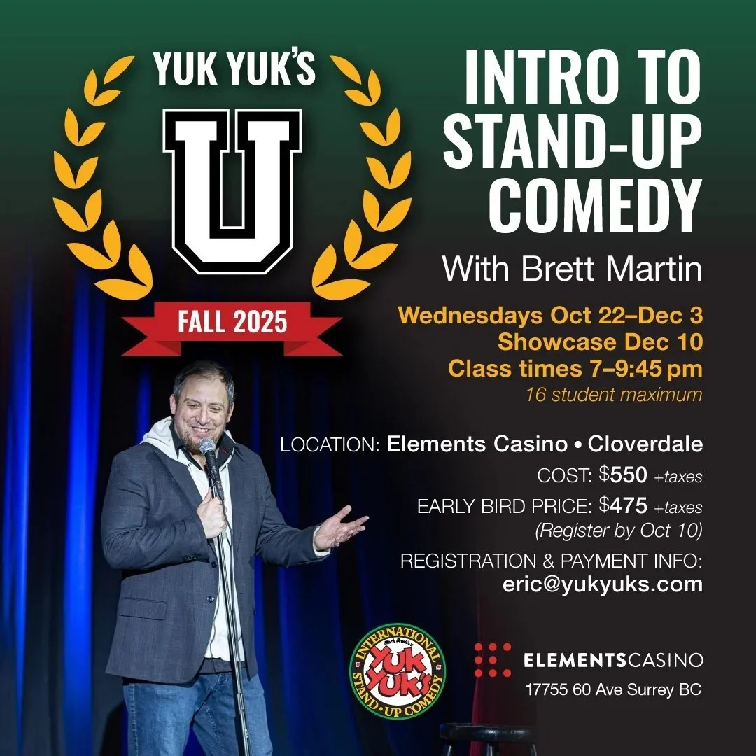 Yuk Yuk’s U - Comedy Course - is back in Surrey on Wednesday October 22, 2025 @ 7pm with an all-new introductory class with professional stand-up comedian Brett Martin. Brett is a nationally touring Yuk Yuk’s headliner whose work has been featured on CTV Comedy and SiriusXM. On top of that, he’s a thoughtful teacher who connects with his students and brings out the best in each aspiring comic and/or public speaker.